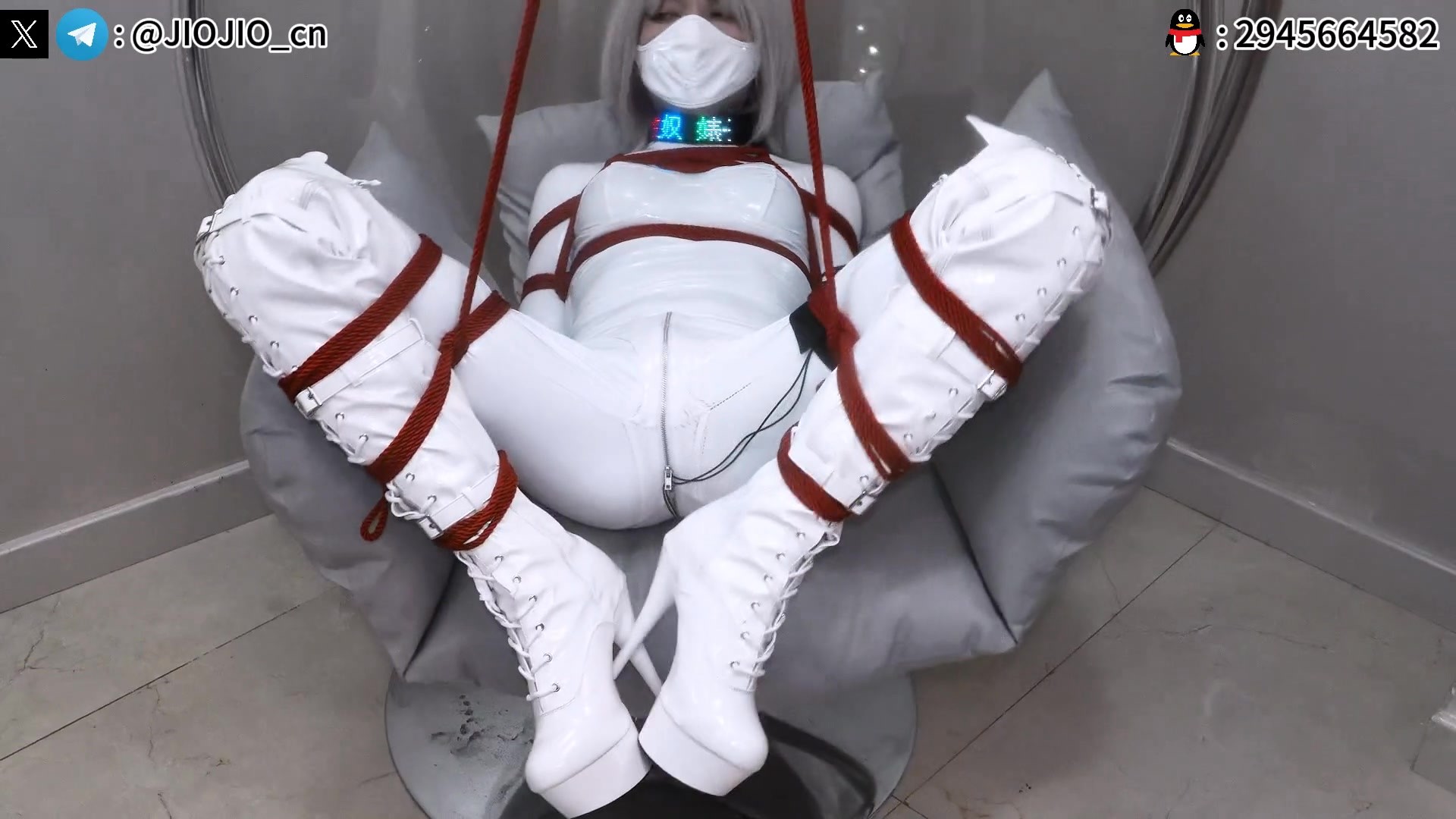 乳白全包PU紧身衣白长靴1 红绳紧缚 M字开腿 日式TK 摇椅放置 郊狼电击 震动B强制GC
